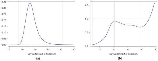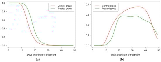 Figure 9b shows that the therapy makes the instantaneous probability of tumors multiplying their initial volume by four over time (if they have not done so before) to be reduced between Days 5 through 45, approximately. The maximum reduction, around 96%, takes place at the beginning of this period, until a minimum reduction rate, of around 8%, is reached by Day 21. The reduction in the instantaneous probability of interest is increased again until day 39, when a new maximum is reached at around 30%. Finally, between days 39 and 45, the effect of therapy on the reduction of the instantaneous probability of tumors multiplying their initial volume by four diminishes until it vanishes completely.