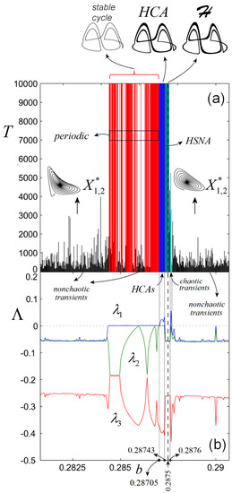 On the other hand, transient chaos appears when trajectories starting from some random initial conditions are chosen near the boundary of the basin of attraction (boundary crisis) or are very close to some bifurcation point. The underlying trajectories behave chaotically, possibly for a relative long time, and then quite abruptly switch to some final periodic state [34,35,36]. Because the lifetime of the transients can be very long (thousands and tens of thousands of numerical iterations), one can never be confident that an observed chaotic system is not a transient (Sprott’s communication). Therefore, to differentiate transients from attractors of the RF system numerically, a compromise with a sufficiently large time interval is made, with and . For , and with the initial condition , Figure 1 shows the lifetime of the trajectories together with the variation in the spectrum of the LEs, , with . In order to increase T over , is used [37]. Note that without using , some of attractors of the RF system transform into chaotic transients. Thus, in this paper the trajectories which reach a final regular motion before (here the stable equilibria ) with an error of less than are considered transients. The system presents two kinds of transients: spirals which lead to and have negative LEs (black line segments, Figure 1a), and chaotic transients with positive maximal LE (light green line segments, Figure 1a). The spectrum of the local finite-time LEs, (Figure 1b), is determined numerically from the system equations with the Wolf algorithm.