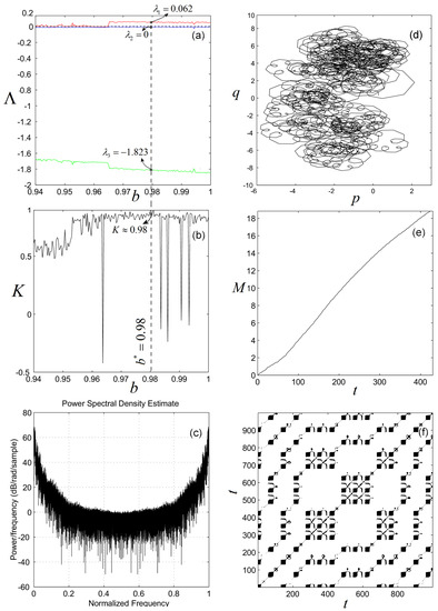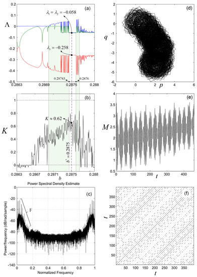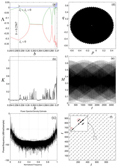 As shown in Figure 6, the LEs are negative for a small but connected interval of b, (Figure 6a); the oscillations of LEs outside indicate presumably attractors’ coexistence; the median K has an intermediate value between 0 and 1, (Figure 6b); the few peaks in the PSD (F in Figure 6c) not covered by the broadband in the PSD indicate that the attractor is neither quasiperiodic nor chaotic. To note that in [38] it was shown that the PSD of SNAs is discrete, but very dense. Additionally, q as a function of p has a graph between a perfect disc (or circle), for the case of regular behavior, and the Brownian motion (Figure 6d), for chaos; the mean-square displacement M presents an oscillating but bounded increase (Figure 6e); the RP, with and , presents many non-equidistant off-second diagonal lines parallel with the second diagonal beside several isolated points.