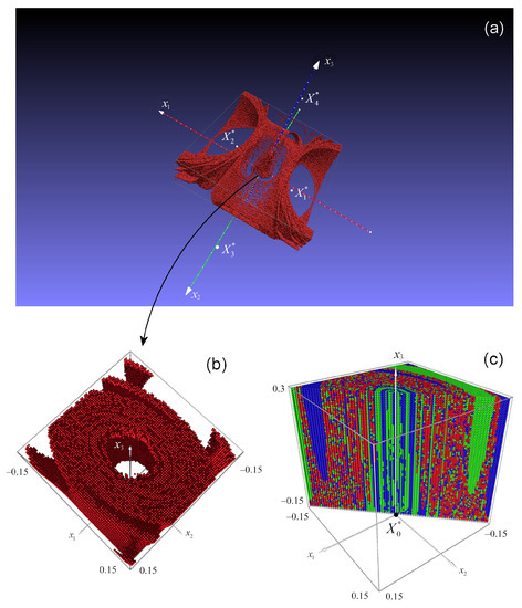 (a) Three-dimensional parallelipipedic representation of the attraction basin (red plot) of the chaotic attractor , determined around the unstable equilibrium ; (b) zoomed area, revealing the fact that there are no initial points within a small cubic neighborhood of ; (c) the same zoomed area presenting, as a supplement, the initial conditions leading to the stable equilibria (blue and red plot).