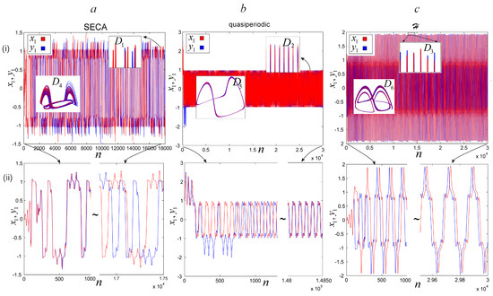 Because of the negativity of the maximal LE on the HSNA , trajectories do not diverge by separating from each other and eventually coincide, as presented in Figure 7. Comparatively, the first components (red plot) and (blue plot) of two trajectories x and y, starting from two nearby initial conditions and for the SECA corresponding to (Figure 7a), the quasiperiodic attractor corresponding to (Figure 7b), and the HSNA (Figure 7c) are considered. In the case of coupled SNAs, this property characterizes a robust synchronization, in the sense that the non-dependence on initial conditions is expected to synchronize the SNAs quickly, even when they operate with different sets of initial conditions [40].