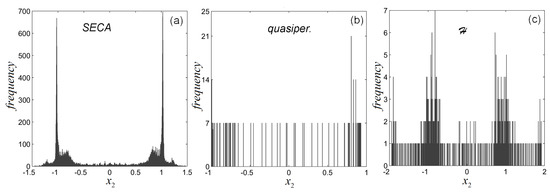 Histograms of the component . (a) The SECA corresponding to ; (b) the quasiperiodic attractor corresponding to ; (c) the HSNA corresponding to .