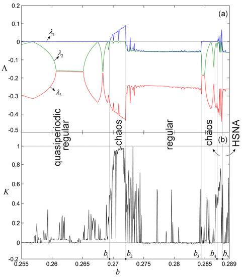 The usual transition does not seem to be characteristic for this system. Indeed, Figure 1 shows that after the interval of b, which generates HSNAs, it follows a parameter window where, after chaotic (with maximal positive LE) or nonchaotic (with negative maximal LE) transients, the system enters into a regular dynamics domain (stable equilibria ). Note that in quasiperiodically forced dynamical systems, the values of the Lyapunov exponents are negative for both quasiperiodic attractors (tori) and SNAs, and in this case the Lyapunov exponents fail to detect transitions from quasiperiodic dynamics to SNAs [42].