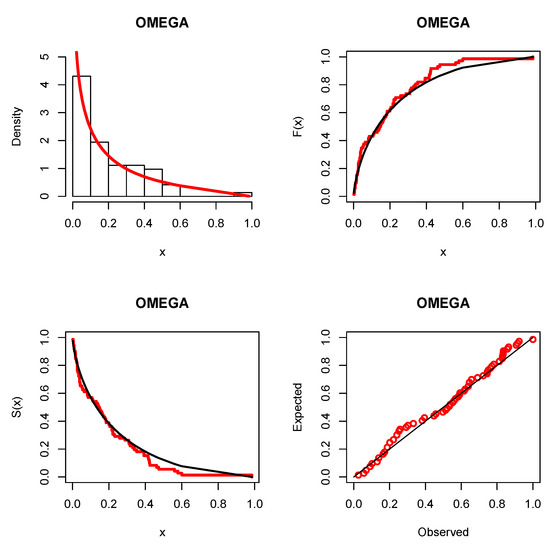The fitted , , survival function, and probability–probability (PP) plots of the omega distribution.
