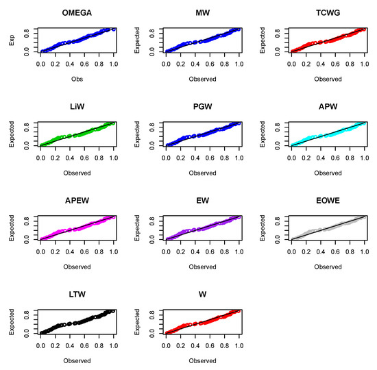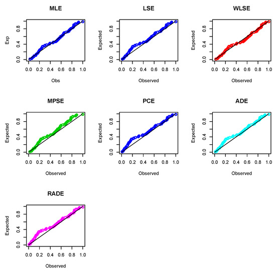 The fitted , , survival function, and probability–probability (PP) plots of the omega distribution are displayed in Figure 1. The PP plots for all fitted models are displayed in Figure 2. The parameters of the omega distribution are estimated using several estimation methods, as listed in Table 9. The PP plots of the omega model using different estimation methods are given in Figure 3.