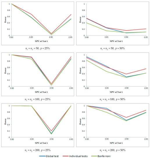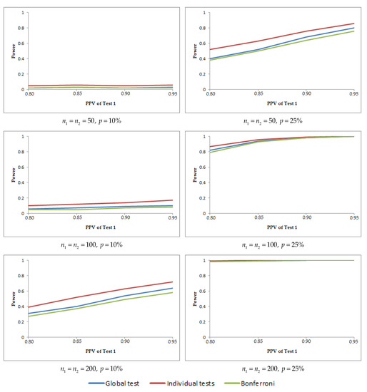 Regarding the powers of the hypothesis tests, in Table 4 and Table 5 we can see some of the results obtained for the global test and other alternative methods. The results obtained with the Holm method are not shown as they are practically the same as those obtained with the Bonferroni method. The power of the global hypothesis test is calculated as the proportion of samples in which it is accepted that or (being true that or ). From the results, the following conclusions are obtained. The disease prevalence has an important effect on the power of each one of the methods to solve the global test, and the power increases with an increase in the prevalence. Regarding the correlations and , these do not have a clear effect on the power, and the power increases sometimes and decreases other times when the correlations increase. In general terms, when the prevalence is small we need large samples so that the power of the global hypothesis test is greater than 80%; for a prevalence of 25% with sample sizes we obtain a power greater than 80%; and for a very large prevalence with sample sizes we obtain a very higher power, greater than 80%–90%, depending on the difference between the PVs.