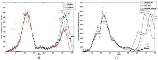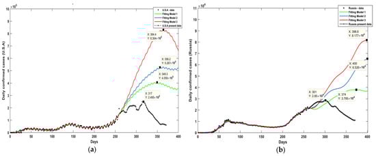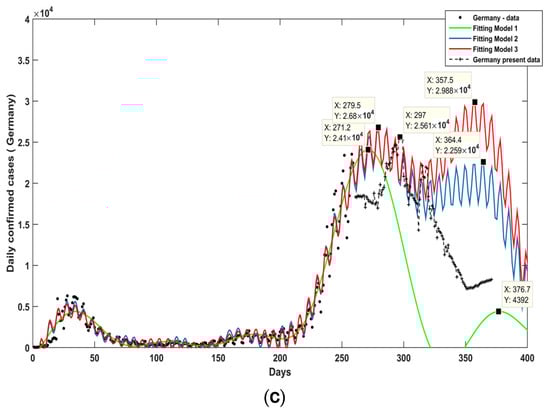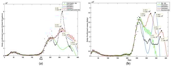 13] are used for generating the predictive regression models without making any statistical modifications on them. The mathematical regression models fit the data from 1 March 2020 (day 0) to 15 November 2020 (day 260) and hence, the models can predict different scenarios for each country in the period from 16 November 2020 (day 261) to 10 April 2021 (day 400). The real smoothed data from [