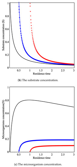 In Figure 1b, the substrate concentration decreases as the value of the residence time increases for different values of . In Figure 1c, the microorganism concentration increases to the maximum value, then decreases as the value of the residence time.