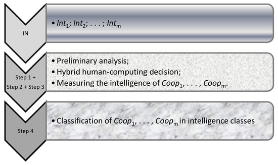 The following notations are used: Coop = {Coop, Coop, …, Coop} denotes the set of CMASs to be compared; |Coop| = m represents the cardinality (number) of compared CMASs; Int = {Int, Int, …, Int}; Int = {In1, In1, …, In1}, Int = {In2, In2, …, In2}, …, Int = {Inm, Inm, .., Inm} denote the obtained intelligence indicators as a result of intelligence measurements using a set of test problems Probl = {Prl, Prl, …, Prl}. Int represents the intelligence indicators for Coop; … Int represents the intelligence indicators for Coop. Table 1 presents the structuring of the measured intelligence indicator data. A line from Table 1, for instance, Prl, In1, In2, …, Inm, represents the measured Prl problem-solving intelligence measure for CoopCoop, …, Coop. In1 represents the Prl problem-solving intelligence measure for Coop … Inm represents the Prl problem-solving intelligence measure for Coop. The number of problems used with the purpose of intelligence measurements is represented by |Probl| = k; |Int| = |Int| = … = |Int| = k represents the cardinality of Int, Int, …, Int.