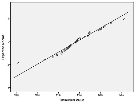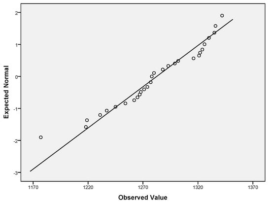 In our algorithm, for the normality verification, we have chosen the KS test [,,], the Lill test [,,], and the SW test []. The Quantile-Quantile plot (QQ plot) is a scatterplot appropriate for the normality visual appreciation. From an interpretation point of view, a QQ plot is a plotted reference line. In the case of normally distributed data, the points should fall approximately along this reference line. The greater the departure from the reference line, the greater the evidence is for the conclusion that the data fail the normality assumption. The joint use of the QQ plot with the SW test is suggested for accurate verification of the normality assumption.