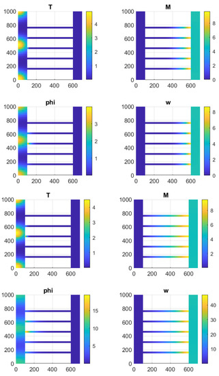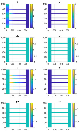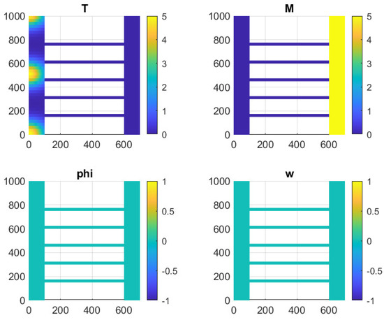 - the introduction of mass-preserving and positivity-preserving permeability conditions at the interfaces between the 2D-fully parabolic model and 1D-hyperbolic-parabolic model—see Section 2.3.3.