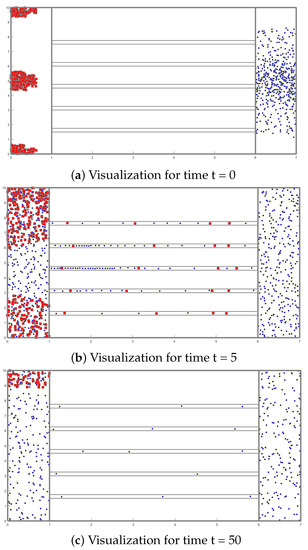 - first scenario (treated case): before enabling cells to migrate, tumor cells are previously treated with a chemoterapy drug. Afterwards, we observe immune cells migrating towards the left chamber where the tumor remains confined, but expresses the chemical stimuli attracting immune cells. Mainly, the dynamics observed in this case is the migration of immune cells from the right to the left in order to attack the tumor cells.