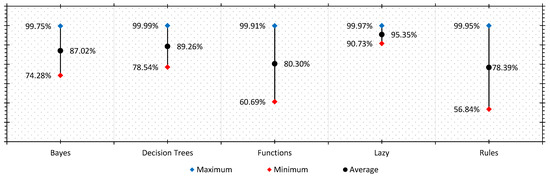 Therefore, in this study, the authors have calculated the minimum, maximum, and average accuracy of Bayes, Decision trees, Functions, Lazy, and Rules group of classifiers concerning the literature outlined in Table 1. The calculated detection accuracy of the research papers surveyed is presented in Figure 2. In Figure 2, almost all groups of classifiers show a maximum accuracy rate of more than 99%.
