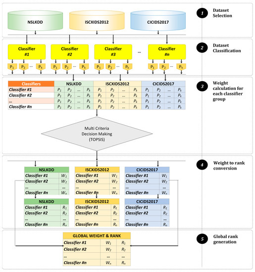 The experiment for evaluating classifiers covers five essential steps [123], such as dataset selection, classification, weight calculation using multi-criteria decision making, weight to rank transformation, and finally, global rank generation. Figure 3 shows the methodology used by the authors.