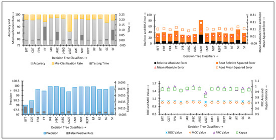 Furthermore, the decision tree classifiers’ performance on a sample of the ISCXIDS2012 dataset is presented in Figure 6. The Functional Trees (FT), J48Consolidated, NBTree, and SysFor classifiers consumed a significant amount of computational time. Nevertheless, the rest of the decision trees consumed 0.001 s of testing time per instance. The J48Consolidated algorithm was limited by presenting the longest amount of time to detect an anomalous instance. However, this computation time consumption supports the fact that J48Consolidated provides the highest accuracy of 98.5546%, which leads to the lowest misclassification rate of 1.4454%. Moreover, J48Consolidated seems to lead the decision trees group with the best Kappa value (0.9711).