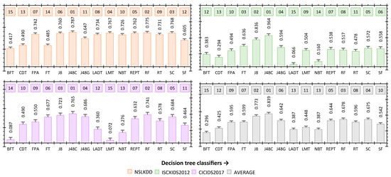 In the intergroup analysis, the authors conclude that decision tree classifiers reveal the best performance for imbalanced IDS datasets. The authors have decided to conduct an intragroup analysis of decision trees for NSLKDD, ISCXIDS2012, and CICIDS2017 datasets. The intragroup study aims to identify the best decision tree within the decision tree group of classifiers for the concerned datasets. Several performance outcomes of decision tree classifiers for NSLKDD, ISCXIDS2012, and CICIDS2017 datasets have been analyzed through Figure 5, Figure 6 and Figure 7.