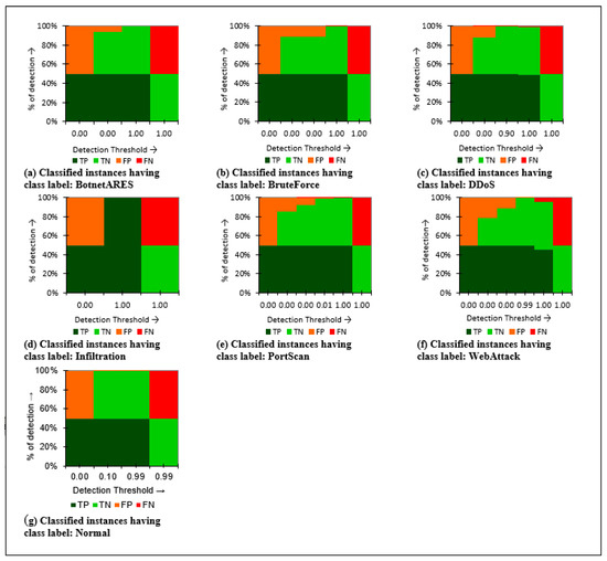 In this section, the J48Consolidated classifier is analyzed, considering the classification of the attack detection process. The classification threshold and the percentage of detection have been taken into consideration while analyzing attack classes. The attack-wise classification output for NSLKDD, ISCXIDS, and CICIDS2017 datasets has been presented in Figure 9, Figure 10 and Figure 11, respectively.