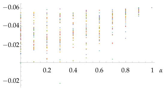 Figure 2 shows the true returns provided by the 50 simulated forecasts for each level of reliability in the first period (August 2014) for the set . Notice that they are bounded by the single true return corresponding to , since no forecast can provide a better true return than the exact one. Figure 3 shows the relative value for each period k. Notice that the data contained in Figure 2 determine a single curve in Figure 3, namely, that taking the least value at . It is calculated as the average of the corresponding values shown in Figure 2 minus the true return provided by HP, which in this case is .