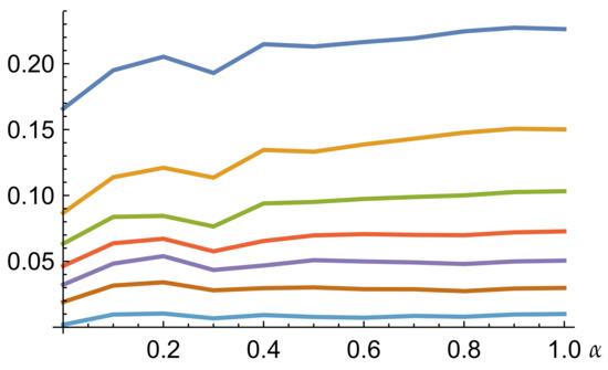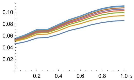 However, Figure 4 shows that these irregular data are hiding a quite regular pattern. The bottom-most curve in this figure is the average of the curves shown in Figure 3, i.e., the curve . As the risk constraint is weakened, i.e., as we consider the constraint sets , for greater values of j, we obtain a strictly increasing sequence of curves approaching the top-most one, which is the absolute value of the simulated forecasts of level .