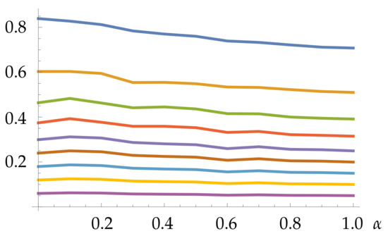 Finally, Figure 5 shows the historical reduction index of the sets for each j and . Again the curves are strictly monotonic: the higher j, the lower curve. We remark again that the regularity shown in Figure 4 and Figure 5 reveal that the means we have taken to calculate them make sense: from a random set of values, one can always take their mean for obtaining a single value, but if the means we have taken had not an intrinsic meaning, the curves in Figure 4 and Figure 5 would be expected to intersect themselves randomly instead of exhibiting such a regular pattern. Hence, we get a strict grading of the considered sets of diversification constraints that is independent of . Thus, we conclude that the index HRI contains sound financial information about the set S.