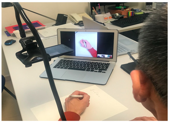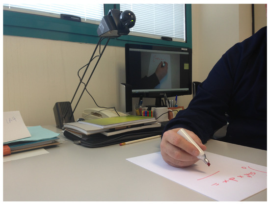 The basic computer equipment required is a computer with a webcam, microphone and speakers. The process is to establish communication by videoconference, which in this case will always be possible given the equipment described and the existence of popular applications such as Skype, Microsoft Teams, Google Meet, etc. During communication, the way to treat scientific symbols without additional devices involves focusing the webcam on a paper document or whiteboard, where the teacher will write his or her explanations, and the student will be able to see it on his or her monitor (see Figure 2). The process can be repeated in reverse when the student wants to represent symbolic objects.
