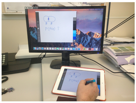 An improvement of the situation described in the previous section is the digitisation of the teacher’s handwriting using a touchscreen device. These devices, together with the right software, provide clear results and an efficient way of managing written notes (screens) that can be reused in office hours of other students, or saved and made available in the course’s VLE. Over time, technology has advanced so that tablets can now capture manual writing very accurately; the Wacom brand (see [15]) is the ultimate exponent. These tablets are connected to the computer via a USB port, and they include software that enables many possibilities: Handwritten notes, artistic drawings, etc.