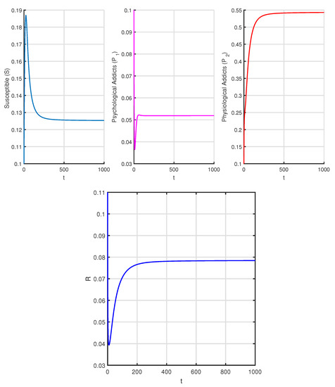 Figure 3 depicts the time series and phase portrait of system (3) (case 1) when the drug addict equilibrium is