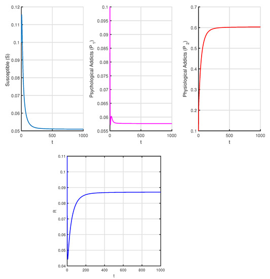 Figure 14 depicts the case when no control is applied. There is a significant number of psychological and physiologically addicted population present in the scenario (