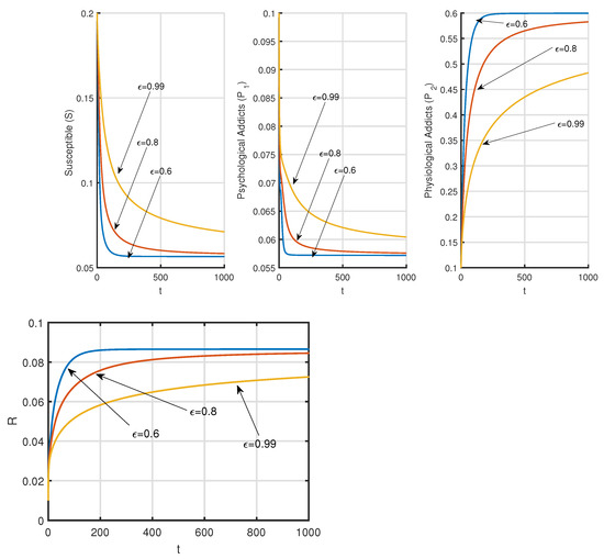 Figure 6, it has also been found that by lowering the value of fractional order, susceptible and psychological addicted populations decrease but the physiological population and population in treatment class increase.