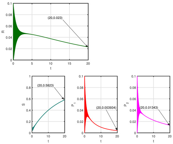 43] used the predictor–corrector scheme based on Adams–Bashforth–Moulton algorithm which is used in FDE12. We have used FDE12 function directly for system (3) just like ODE45, ODE23.