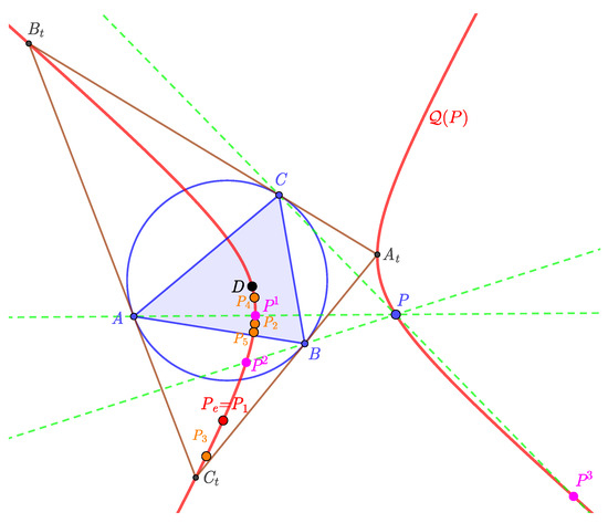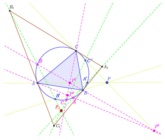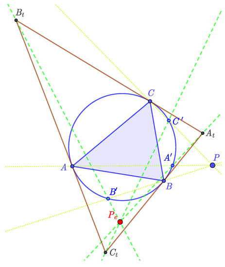 Minevich and Morton [2] defined a similar, so-called “TCC-perspector”, transformation with respect to , and they gave a nice connection between the isogonal transformation and the “TCC-perspector”. For more details and the history of the Exeter point see, ex., in [1,2,3,4,5,6].