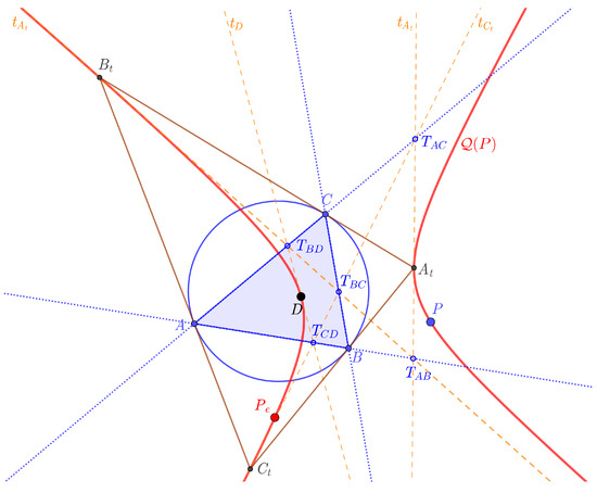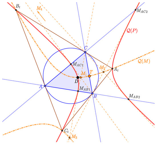 For example, the barycentric coordinates of each point of the line are , where the parameter . If , then we have or , and in the case of the point coincides with C, which is one of the points of the circle . Thus, the parameters describe one of the segments , which is the side of . Now, we consider the equation of the line (in the proof of Lemma 1, it is the line ) and substitute into the equation. After a short calculation, we express , where . With similar calculation, we can prove that the other two projected points are on the sides of as well. □