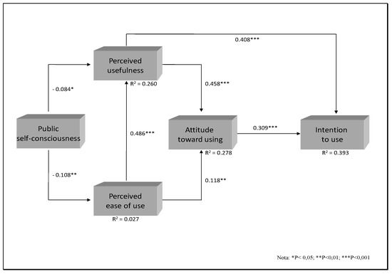 Regarding the reliability of the indicators, all their values with respect to the variables that represent the original model of the TAM are higher than the recommended values. However, the same does not occur with the three dimensions of self-consciousness. Therefore, the results obtained recommended to remove several items of each dimension, finally leaving three indicators of private self-consciousness, two indicators of public self-consciousness, and three indicators of social anxiety.