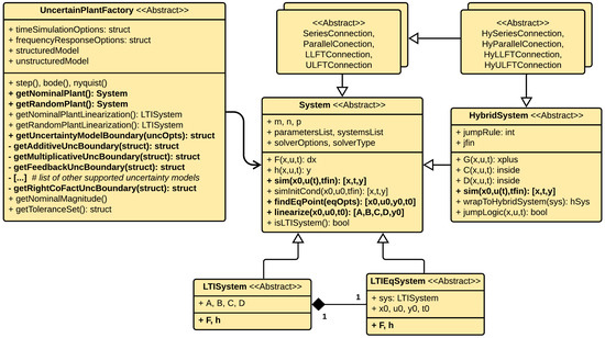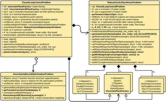 Figure 4 encompasses an overview of the toolbox classes described in Section 2.5 and Section 2.6, along with showing their relationship with the classes from the previous sections. Based on any desirable combination of the above system classes, i.e., System, LTISystem, LTIEqSystem, HybridSystem, and their interconnections, we propose a new functionality to aid in uncertain system modeling, ready for use in augmenting the plant for μ synthesis, implemented in the classes UncertainPlantFactory, seen in Figure 1, along with UncertaintyBoundOptimizationProblem, seen in Figure 4.