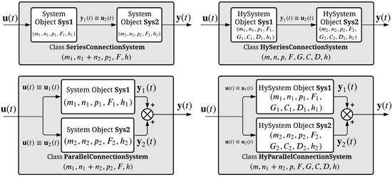 The software classes presented in this section extend the series, parallel, feedback, and lft functions from MATLAB for nonlinear and hybrid systems, based on the interfaces from Equations (1) and (4). For hybrid system interconnections, the continuous and discrete dynamics sets C and D , respectively, are obtained using union and intersection set operations.