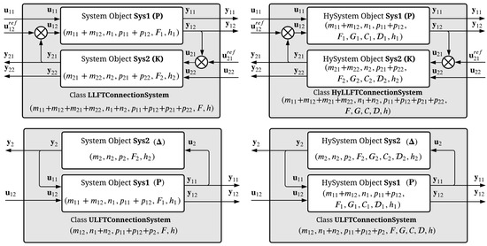 The state, output, and hybrid domain equations for nonlinear and hybrid system lower linear fractional trasformation (LLFT) connection, with the notations used in Figure 3, upper row, implemented in classes LLFTConnectionSystem and HybridLLFTConnectionSystem, are as follows: