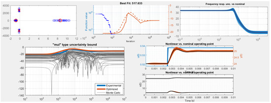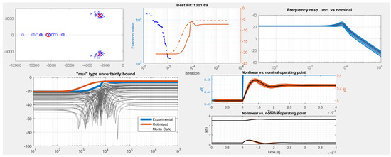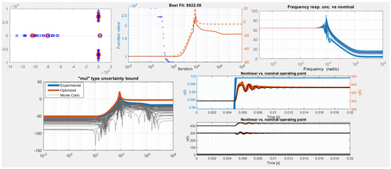 An input multiplicative uncertainty model, i.e., G ( s ) = G n ( s ) 1 + Δ ( s ) W u n c ( s ) , | | Δ | | 1 , as in Table 1, has been automatically computed from input u 3 ( t ) to output y 1 ( t ) , with tolerances ± 1 [V] and ± 1 [ Ω ] for inputs u 1 ( t ) = E and u 2 ( t ) = R , respectively, based on 1000 Monte Carlo simulations. The relevant frequencies vary in the interval ω ̲ = 10 1 , ω ¯ = 10 7 , with 200 equally distributed samples in log domain. A successful set of hyperparameters for the particle swarm optimization algorithm is comprised of a swarm size of 1500, initial swarm span of 10 4 , minimum neighbors fraction of 0.9 , and inertia range of 0.1 , 1.1 for a transfer function structure as in Equation (19), with two real poles and two real zeros, resulting in