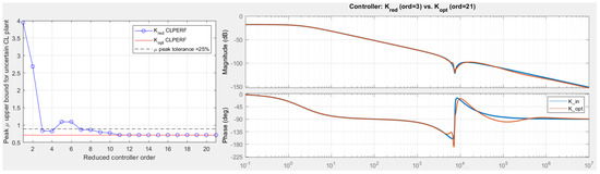As specified by the n = 2 and A T = 10 4 parameters of the complementary sensitivity weighting function, W T , the closed loop control system mitigates sensor noise signals with a considered spectrum starting from ω B T > 12,000 [rad/s], using an initial roll-off of 40 [dB/dec], followed by an attenuation of at least four orders of magnitude. From the μ synthesis, a controller of order 17 is obtained. After order reduction, the smallest controller which manages to assure all imposed specifications for the plant family, with a peak μ Δ ( LLFT ( P , K ) ) 0.97 < 1 , is