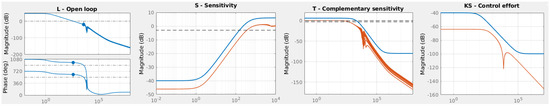 For controller synthesis, the weighting function specifications were for the sensitivity function ω B = 1200 [rad/s], A = 10 4 , M = 2 , n = 1 ; for the complementary sensitivity function ω B T = 12 × 10 3 [rad/s], A T = 10 4 , M T = 2 , n = 2 ; and for the control effort M 0 = 0.1 , M = 100 , | W K S ( j · 1200 ) | = 2 , resulting in