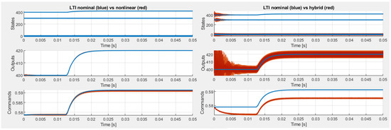 Nonlinear MiL simulation options are N = 50 random plants from the uncertainty set, with the ode15i solver, with a step on the reference signal of 5 % from its initial equilibrium value of approximately 5 [V] and a simulation time of 0.02 [s]. The simulation conditions for the hybrid MiL case are almost identical, with the use of the ode113 solver instead, set to a relative tolerance of 10 8 , and with an additional PWM period selected randomly for each experiment from a nominal value T P W M = 17.5 [s] with a ± 20 % fluctuation from one simulation to another. A comparison of the nonlinear and hybrid cases is presented in Figure 15, where it can be seen that the transitory regime is practically identical. Due to working with u R ( t ) instead of u C ( t ) only for the output signal, the current ripple is propagated into the measured voltage.