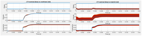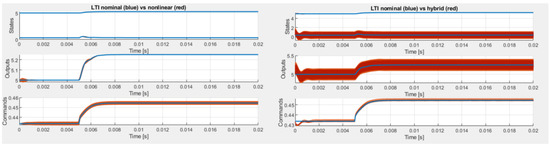 The nonlinear MiL simulation options are N = 50 random plants from the uncertainty set, with the ode23t solver, with a step on the reference signal of 5 % from its initial equilibrium value of approximately 5 [V] and a simulation time of 0.02 [s]. The simulation conditions for the hybrid MiL case are identical, with an additional PWM period selected randomly for each experiment from a nominal value T P W M = 17.5 [s] with a ± 20 % fluctuation from one simulation to another. A comparison of the nonlinear and hybrid cases is presented in Figure 13, where it can be seen that the transitory regime is practically identical. Due to working with u R ( t ) instead of u C ( t ) only for the output signal, the current ripple is propagated into the measured voltage.
