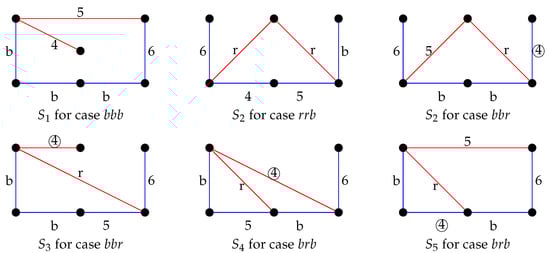 In this strategy, the Builder first shows a path . Therefore, one of the four possible color patterns appears: , , , and . The Builder has to avoid the pattern , otherwise, the Painter has a strategy to ‘survive’ to the end of the sixth round. In order to do that, the Builder can use the same strategy as for the case described by Prałat in []. Finally, the Builder obtains a blue in the next three moves (the details as shown in Figure 3 in []).
