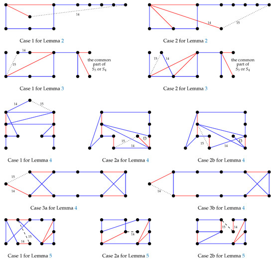 The Builder starts with -game and he uses it to force a blue copy of in at most 13 moves. If the Builder has achieved this goal in 12 or fewer moves, then by using Lemma 6 we have the result. The case that remains to be considered is when the -game ends by forcing the Painter to create a blue in the 13th round. We will apply the strategy described in the proof of Theorem 3 and prove that in each of the cases considered in Lemmas 2–5, two moves are enough to force the Painter to create a red or a blue .