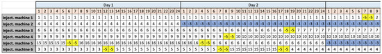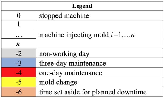 Each matrix element represents the state of the injection molding machine i in time slot j. It is symbolized by a numerical value. The value 0 indicates that the respective injection molding machine is stopped, values 1 to n state that mold is being injected in the respective time slot on the respective injection molding machine, value refers to a non-working day slot time, value and denote three-day and one-day maintenance processes, respectively, value represents a mold change and value specifies planned downtime. Colors are also used to improve solution interpretability, see Figure 1.