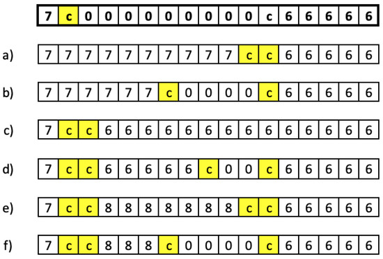 Examples of neighborhood definition 3: (a) corresponds to an injection with the same mold that was used before the gap and covers the entire gap, where the mold used afterwards is different, (b) is the same as (a) but the gap is not completely covered, where the mold has to be removed leaving a smaller gap, (c) corresponds to an injection of a different mold than the one used before the gap, covering the entire gap, where the same mold is used afterwards (there is no change of mold at the end of the gap), (d) is the same as (c) but the gap is not completely covered, where the mold is removed leaving a smaller gap, (e) corresponds to an injection of a different mold from the one before and after the gap which covers the entire gap, and, finally, (f) is the same as (e) but the gap is not completely covered, where the mold has to be removed leaving a smaller gap.