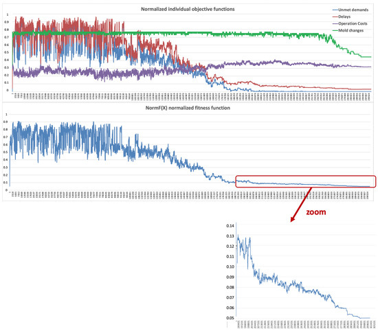 The optimization process will account for four objective functions simultaneously. The first two objectives refer to orders. On the one hand, we have to take into account delays with respect to daily part orders and, on the other, orders that are not met on schedule. Initially, unmet parts orders and parts order delays will not be prioritized, the aim being to minimize the total sum of unmet orders and delays. Besides, production costs also have to be reduced to a minimum, and we consider the cost of electricity consumption in the injection process and gas consumption associated with the melting furnaces. Finally, the number of mold changes must be minimized. The four objectives are normalized and incorporated into a weighted additive fitness function, where the weight represents the relative importance of the objectives.