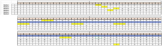 We assign the value −4 for the elements associated with machines under one-day maintenance, whereas machines undergoing three-day maintenance are marked −3 because they are operating at only c% of their capacity, taking into account the maintenance matrix (input) in both cases. Finally, we enter −6 in the column cells at the end of the solution matrix set aside for planned downtime to cover machine breakdowns.