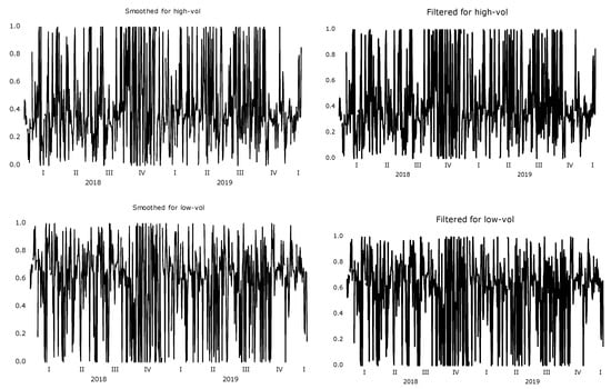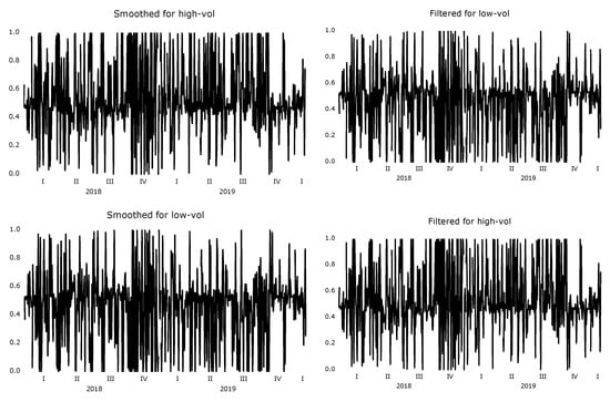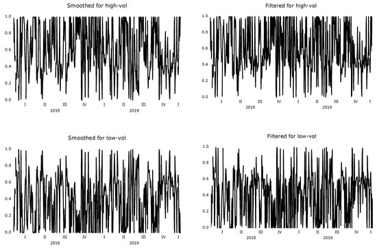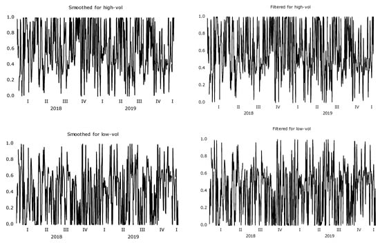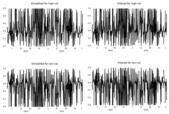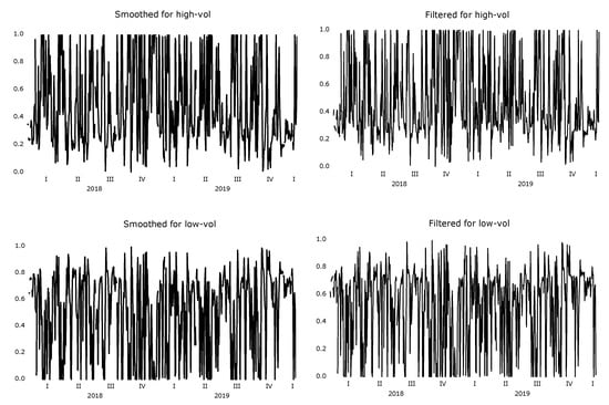 Figure 3, Figure 4, Figure 5, Figure 6, Figure 7, Figure 8, Figure 9, Figure 10 and Figure 11 show the filtered and smooth probability plots for the nine high-tech ETFs. The heteroscedastic MRS (1,1) models cause switching between regimes for all nine high-tech ETFs, which are consistent with the probabilities of staying and switching. Hence, association between regimes can be crucial to capture volatility clustering. Figure 3, Figure 4, Figure 5, Figure 6, Figure 7, Figure 8, Figure 9, Figure 10 and Figure 11 also indicate similar patterns across the nine high-tech ETFs where, as expected, the probability of the ETF price return is slightly higher in a low volatility regime than in a high volatility regime, indicating that ETFs can be used to a certain extent as hedging tools.
