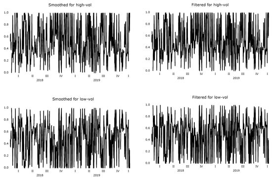 The likelihood of each regime remaining in the same regime interval demonstrates the presence of a moderate volatility clustering among the excess returns of ETFs. In other words, a high volatility observation is preceded by a low volatility observation, and vice versa; also, no re-estimation of the two-regime heteroscedastic MRS model with restrictions on the transition matrix was required since none of the transition probabilities have near-zero values.