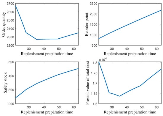 In the previous section, we observed that the optimal preparation time significantly depends on the components’ attributes, i.e., the amount of reduction in component duration possible, the unit crashing cost. If we closely look at the component details, it can be found that the reduction in preparation time is happening step-wise, i.e., the activity with the lowest unit crashing cost is reduced to the lowest possible duration followed by the next component. In our case, the preparation time comes out to be 35 days, which is 28 days less than the sum of normal activity. At L = 35 days, , which indicates that Component 1 and Component 2 are fully exploited through crashing. The effect of preparation time reduction can also be observed in the order quantity and reorder level. As the preparation time decreases, the reorder level decreases and the order quantity increases and vice versa. It may be noted that this result is in sync with the findings of Kumar and Goswami [5]. They carried out a sensitivity analysis on the lead-time and showed that the reorder level increases as the lead-time increases and vice versa. However, our objective is to find the optimal lead-time when a reduction of lead-time is possible through crashing of component time. Moreover, in the previous section, we carried out a sensitivity analysis to understand the effect of parameters such as holding cost, shortage cost, and backorder cost on the solution outcome. With the increasing holding cost the reorder level decreases, and so for the backorder cost. However, with the increasing shortage cost, the reorder level increases.